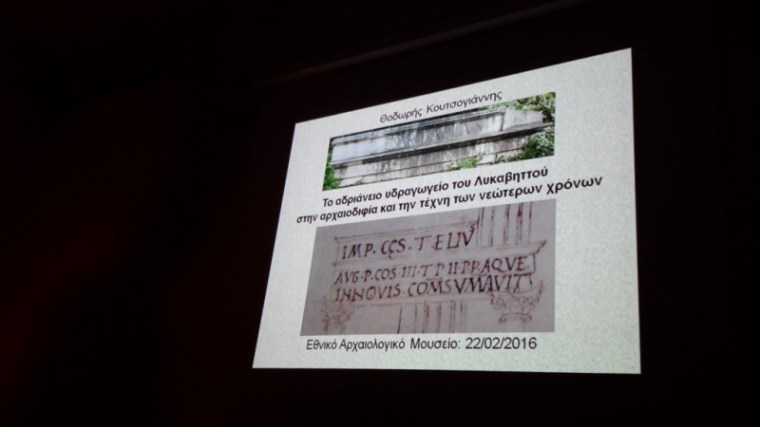 Τη Δευτέρα 22 Φεβρουαρίου 2016, ο Δρ Θοδωρής Κουτσογιάννης, Έφορος της Συλλογής Έργων Τέχνης της Βουλής των Ελλήνων, πραγματοποίησε διάλεξη με θέμα: “Το αδριάνειο υδραγωγείο του Λυκαβηττού στην αρχαιοδιφία και την τέχνη των νεώτερων χρόνων”.