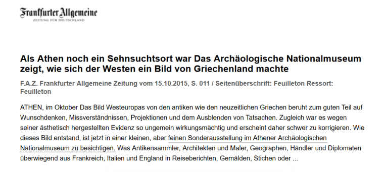 νικό Αρχαιολογικό Μουσείο, στη γαλήνια κόγχη της περιοδικής έκθεσης για τους «Περιηγητές και τις αρχαιότητες», άκουσα κάποια στιγμή τα τζιτζίκια. Το φως σε εκείνο το σημείο έπαιρνε τη θέρμη του δειλινού, δίπλα σε ελιές και φρύγανα, σε μια προσπάθεια ανασύστασης του μικρόκοσμου της παριλίσιας Αθήνας των κλασικών χρόνων.