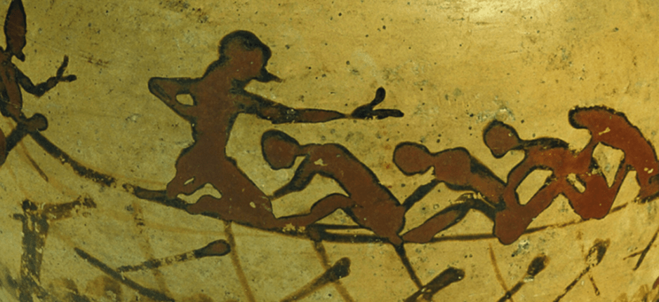 Στην πρύμνη εικονίζεται ο πηδαλιούχος, ενώ ο κελευστής όρθιος δίνει το παράγγελμα στους κωπηλάτες. Ποντοπόρα πλοία σαν αυτό, ταξίδεψαν σε ολόκληρη τη Μεσόγειο.