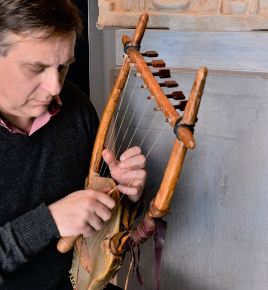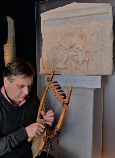 Στη φωτογραφία ο μουσικοσυνθέτης Δρ Ν. Ξανθούλης με ανακατασκευασμένη αρχαία λύρα, μπροστά στο αναθηματικό ανάγλυφο που φέρει παράσταση της σκηνής αναγνώρισης του Οδυσσέα από τη γριά τροφό του Ευρύκλεια. Στη δεξιά πλευρά, μπροστά σε όρθιο αργαλειό, η Πηνελόπη (4ος αι. π.Χ., από το Μουζάκι Καρδίτσας). (© TAΠΑ/Εθνικό Αρχαιολογικό Μουσείο)