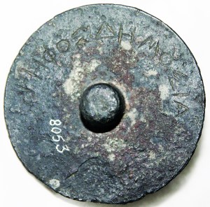 Χάλκινος δίσκος με συμπαγή κεντρικό άξονα. Φέρει εγχάρακτη επιγραφή: ΨΗΦΟΣ : ΔΗΜΟΣΙΑ. Χρησιμοποιήθηκε ως αθωωτική ψήφος σε κάποιο από τα δικαστήρια της Αθηναϊκής Δημοκρατίας. Τέλη του 4ου αι. π.Χ. Πιθανόν από την Πνύκα. ΕΑΜ Χ 8053