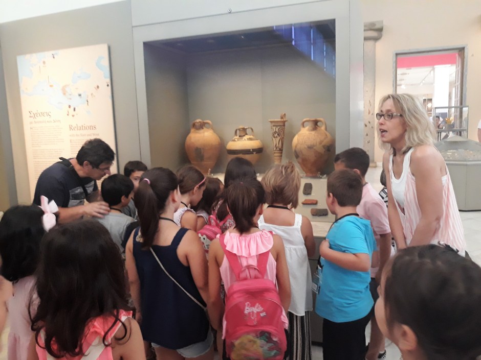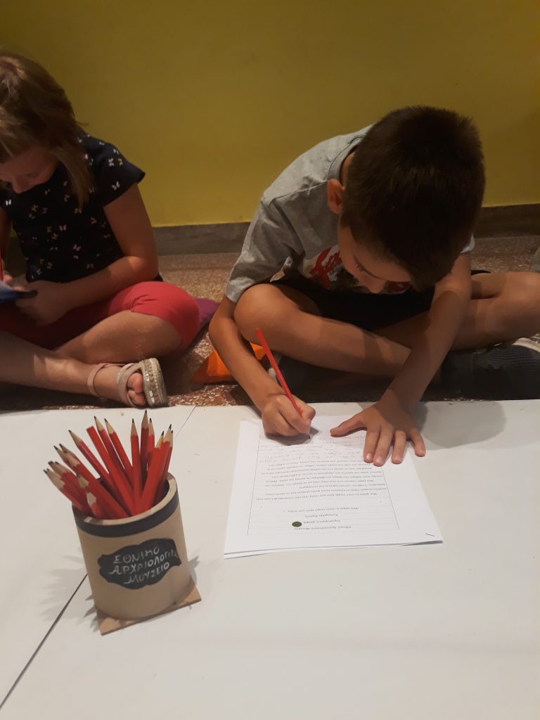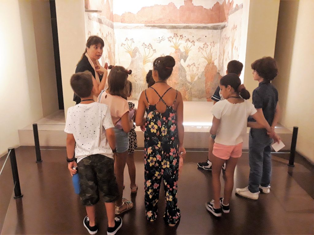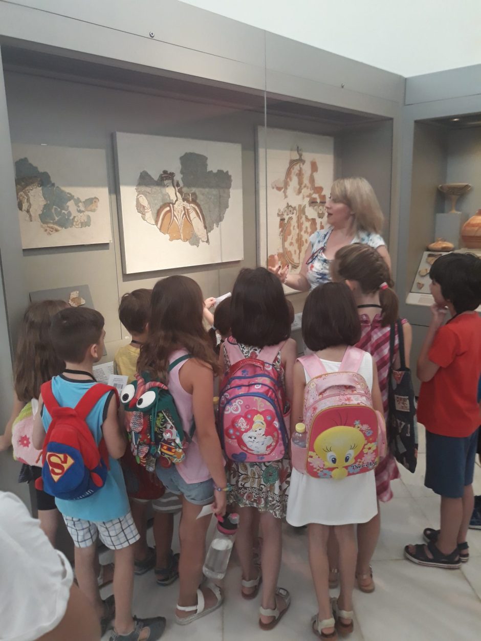 Με την καθοδήγηση της αρχαιολόγου-μουσειολόγου Δ. Καλεσοπούλου τα παιδιά (8-12 ετών) περιηγήθηκαν στην αίθουσα της Θήρας και στη συνέχεια άφησαν ελεύθερη τη φαντασία τους να αναπλάσει στιγμές από τη ζωή στον αρχαίο οικισμό. Τη σχετική δράση υποστήριξε η συγγραφέας Ευ. Στρατή.