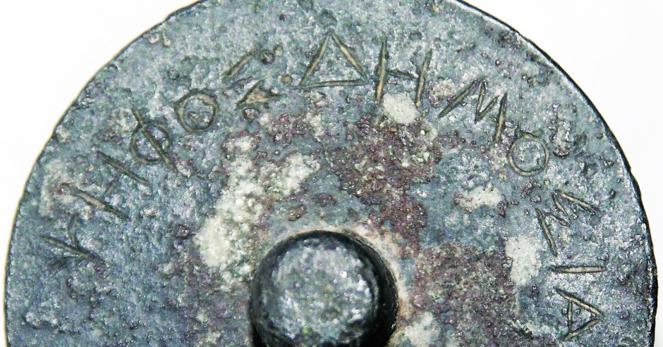 Χάλκινος δίσκος με διάτρητο κεντρικό άξονα. Φέρει εγχάρακτη επιγραφή: ΨΗΦΟΣ : ΔΗΜΟΣΙΑ. Χρησιμοποιήθηκε ως καταδικαστική ψήφος. Συλλέγονταν σε ειδική ψηφοδόχο κάλπη πριν την καταμέτρηση. 4ος αι. π.Χ. Αθήνα, Δυτική Κλιτύς Ακρόπολης. ΕΑΜ Χ12220.