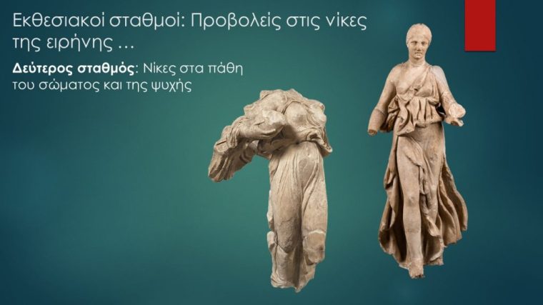 Το δίπολο «σώμα και πνεύμα» εκφράστηκε σε γυμναστήρια, στάδια και θέατρα, σε αθλητικούς, μουσικούς και δραματικούς αγώνες αλλά και στα μεγάλα θεραπευτήρια εκεί όπου κατέφευγαν όσοι προσπαθούσαν να αντιμετωπίσουν τα πάθη του σώματος και της ψυχής. Η Νίκη που διακοσμούσε το κεντρικό ακρωτήριο του ναού του Ασκληπιού στην Επίδαυρο κρατούσε στα χέρια της μια πέρδικα, σύμβολο της θεραπευτικής δύναμης του θεού. Ελπίδα και θάρρος στον καθημερινό προσωπικό αγώνα χάριζαν και οι λαμπρές μαρμάρινες Νίκες στο ναό της Αρτέμιδας του ίδιου ιερού που θα συμμετέχουν με το δικό τους μήνυμα στο εκθεσιακό μας αφήγημα.