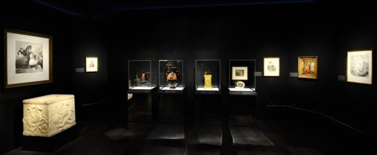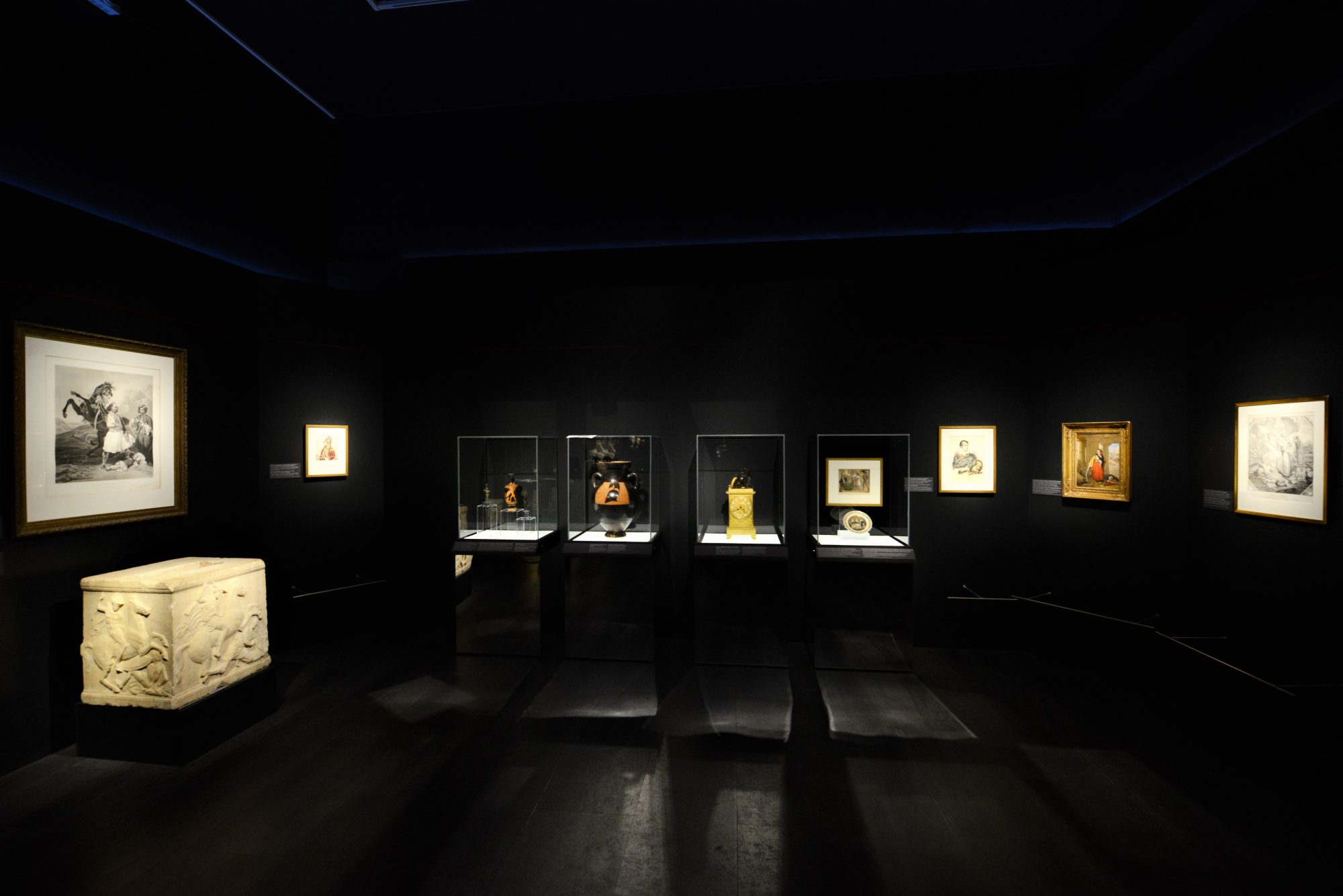 Twenty-six selected antiquities (22 marble sculptures and reliefs, 2 clay vases, 2 bronze figurines) from the collections of the National Archaeological Museum are showcased in an eclectic «dialogue» with twenty-six recent works of the 18th and 19th century, most of them by European artists: 8 paintings (oil and water color ones), 11 austere engravings, 4 illustrated editions and 3 artifacts of decorative art, temporary loans from the Library and Art Collection of the Hellenic Parliament, the National Historical Museum, Benaki Museum, Museum of the City of Athens – Vouros-Eutaxia Foundation, National Gallery – Alexandros Soutsos Museum, Stephan Adler Collection, as well as the Michalis and Dimitra Varkaraki Collection.