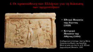 Ο αγώνας, ωστόσο, για την προστασία των αρχαίων έπρεπε να αναληφθεί συστηματικά από την ελληνική πολιτεία. Σε αυτές τις προσπάθειες εστιάζει η τέταρτη ενότητα της έκθεσης. Παρουσιάζονται αρχαία έργα που κάποτε αποτέλεσαν τις πρώτες συλλογές στο Εθνικό Μουσείο της Αίγινας (1829), στο Κεντρικό Μουσείο της Αθήνας (1834), στο Βαρβάκειο Λύκειο (1837) και ακόμη αρχαιότητες που προήλθαν από τις πρώτες συστηματικές ανασκαφές της Αρχαιολογικής Εταιρείας στους νότιους πρόποδες της Ακρόπολης και στην κοίτη του Ιλισού.