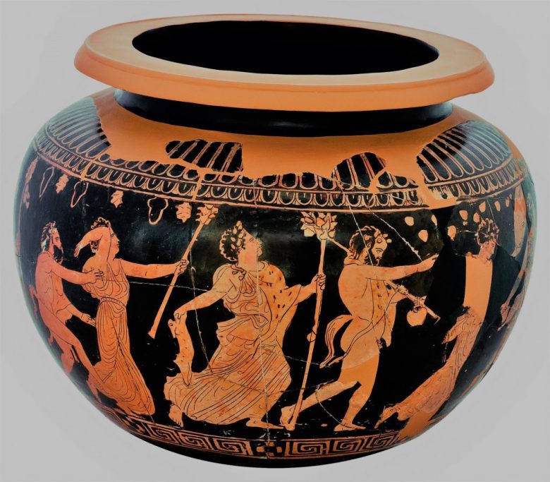 Θυρσοφόροι Σάτυροι και Μαινάδες στροβιλίζονται σε εκστατικό διονυσιακό χορό. Αττικός ερυθρόμορφος δίνος. Του ζωγράφου του Δίνου. Από την Αθήνα. 420-410 π.Χ. ΕΑΜ Α 14500.