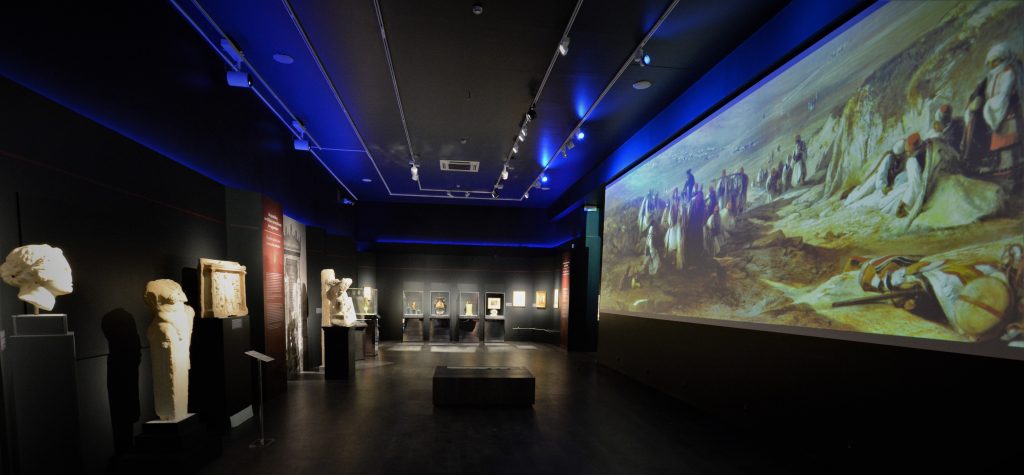 The exhibition is enhanced by digital projections that feature landscapes of pre-revolutionary Greece, accompanied by a text of Chateaubriand, an ardent supporter of the Greek cause, who in a lively manner remarks upon the harmonious relationship of the natural landscape with antiquities.